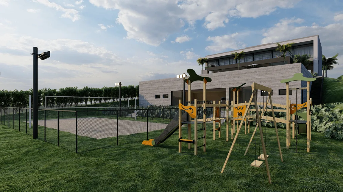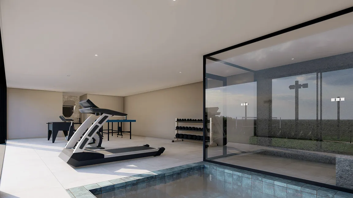 No pavimento inferior está a academia com salão de jogos, sauna, espaço para plauyground e quadra de beach tennis.