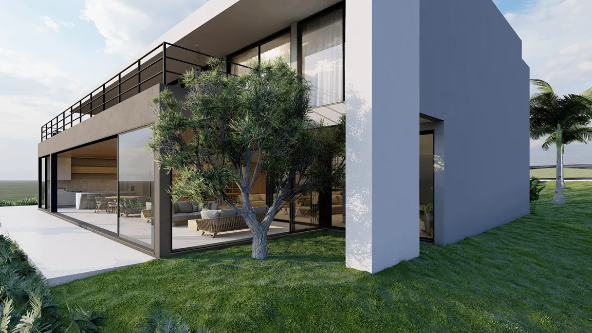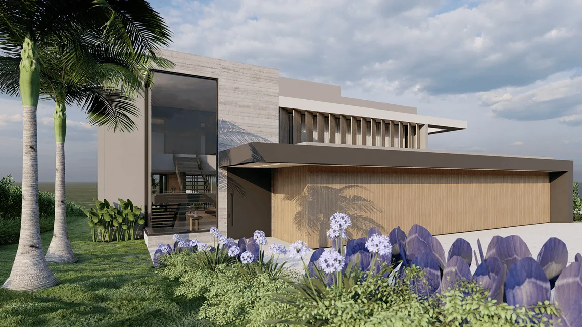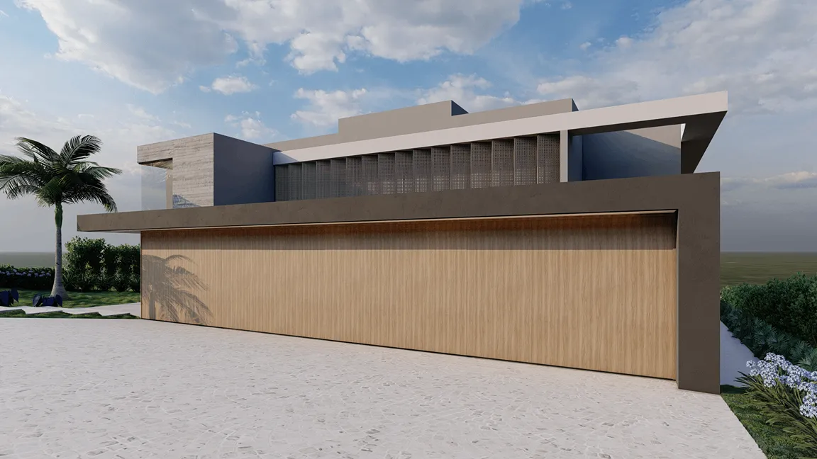 Esse projeto moderno tem como seus principais elementos: pórticos, volumes, tonalidades das pinturas externas trabalhando as fachadas, revestimentos em ripas de concreto e madeira.