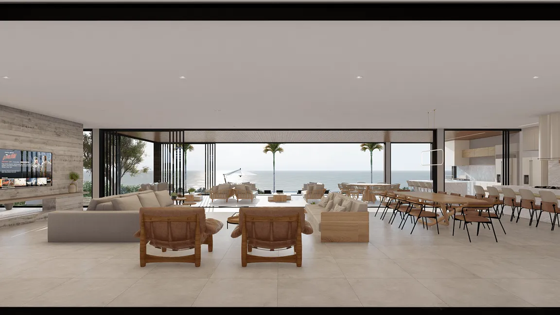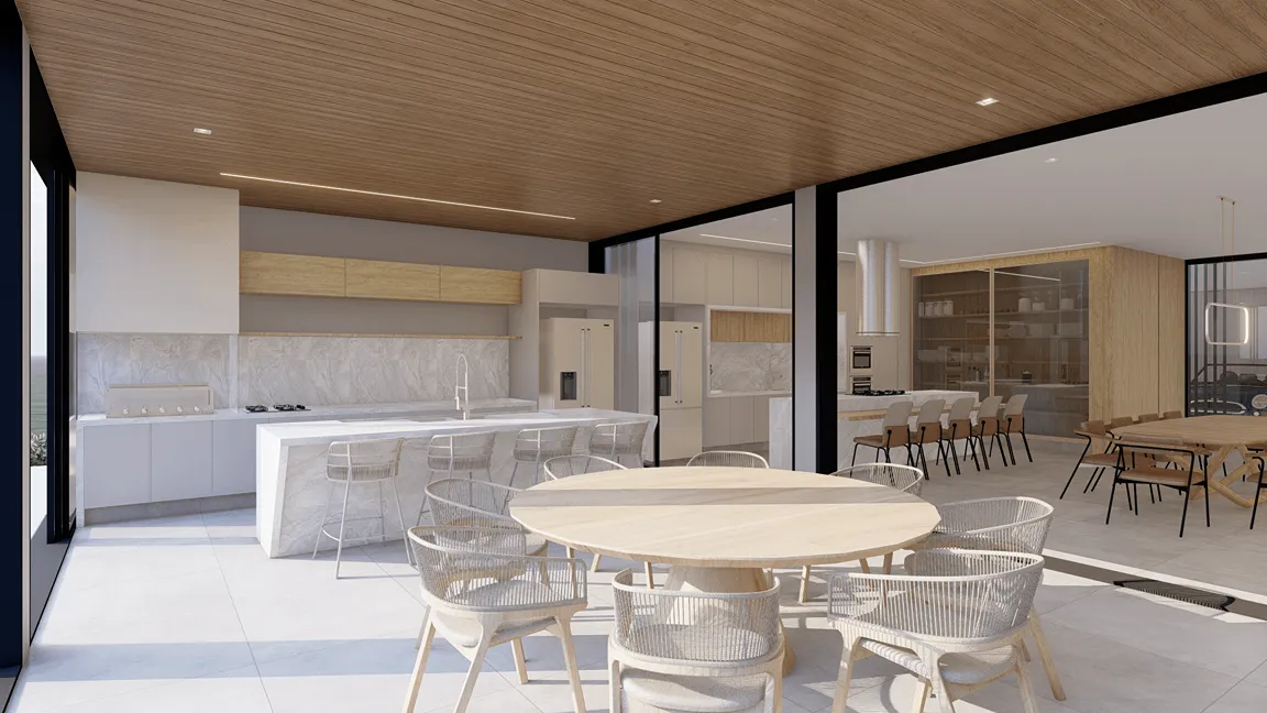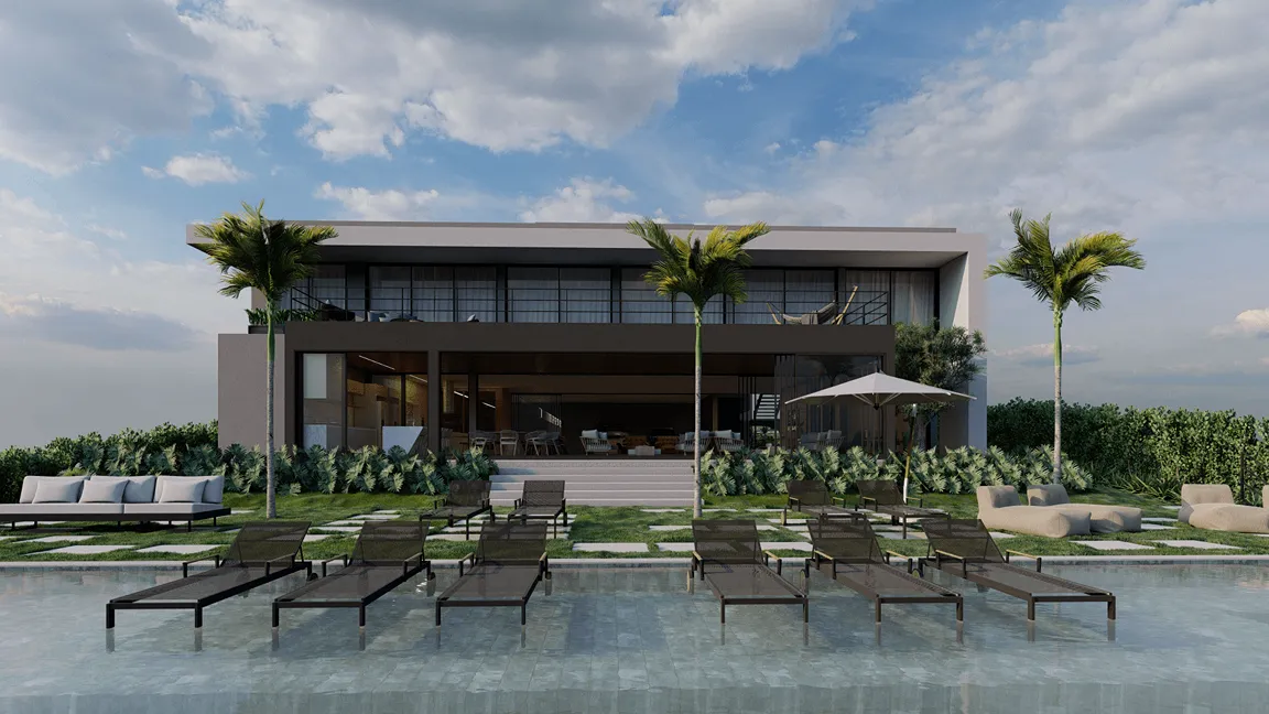 As transições entre os níveis acontecem de forma gradual e permeadas através dos jardins. O platô da piscina cria um belo jardim e área de estar, situado 1,00m abaixo do pavimento térreo, tornando a visão do horizonte limpa e fazendo com que a piscina, com comprimento de 24m, se torne uma extensão da represa.