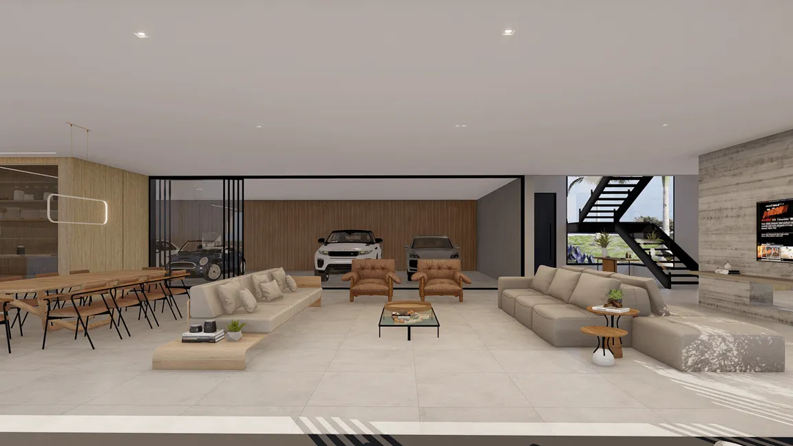 O pavimento térreo abriga as áreas sociais, todas integradas e abertas ao exterior, através de panos de vidros. A pedido dos clientes, a garagem recebeu portão de fechamento em relação à rua e portas de vidro de fechamento em relação às salas, a fim de que se tornasse um expositor aos que ali estiverem.