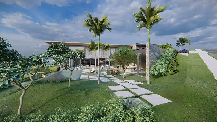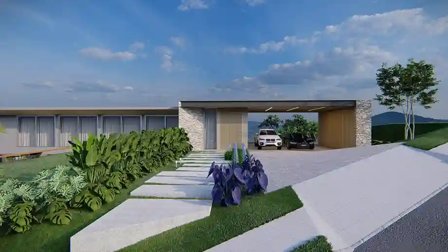 Há duas opções para se acessar a entrada da casa: percorrer um caminho frontal de acesso ao hall do superior ou seguir pelo caminho em nível que dá acesso à área de lazer.