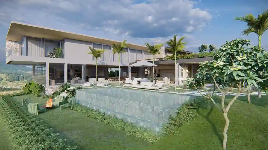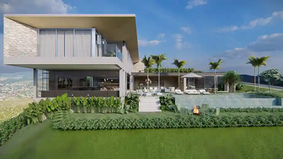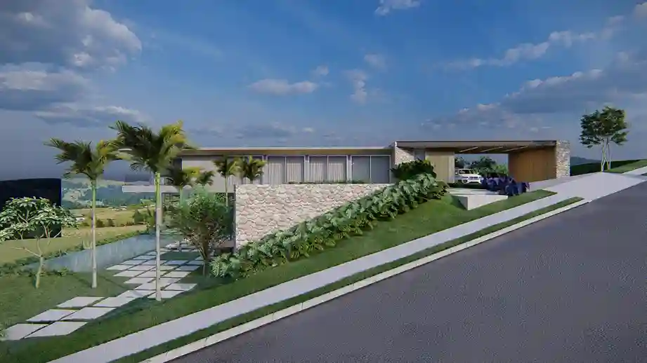 A residência K7 foi implantada num terreno em declive. O projeto buscou privilegiar a potente amplitude visual da paisagem. A topografia acentuada do terreno condicionou a criação de um grande jardim de entrada, distribuído em taludes e patamares, que permite o ajuste dos níveis do terreno. Dessa leitura, surgiu a imagem de um volume longilíneo, paralelo à via principal, com amplos e esbeltos beirais formando varandas generosas. A construção foi elevada até a cota mais alta do terreno, possibilitando um pavimento inferior camuflado por taludes de vegetação e muros de pedra, onde foram locadas as áreas sociais, saunas, spa, piscina e área de lazer.
