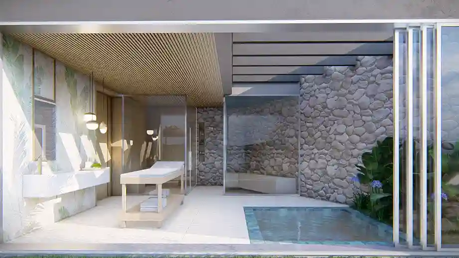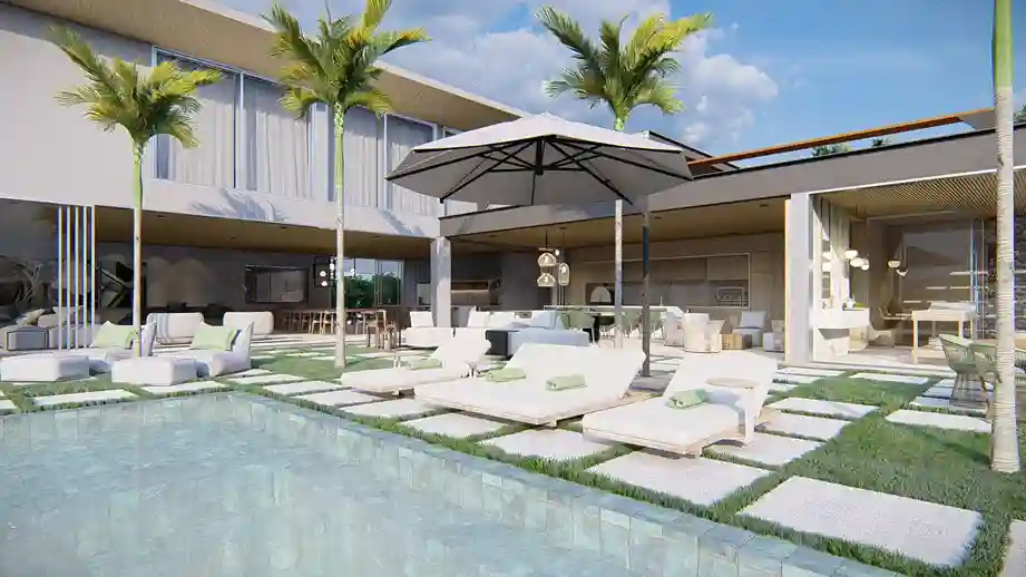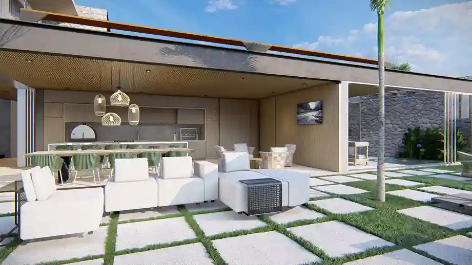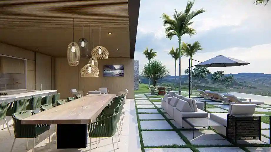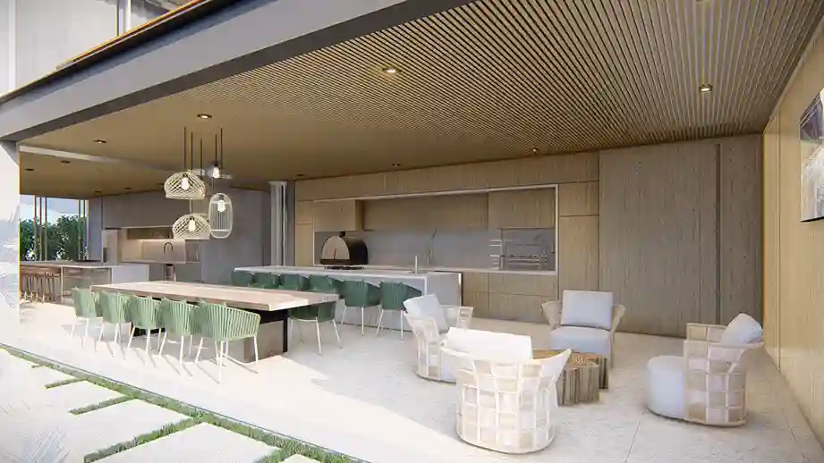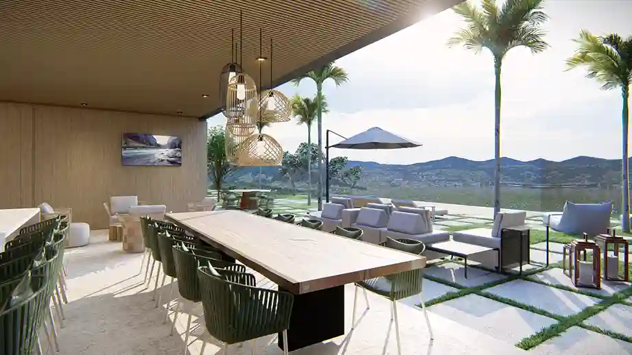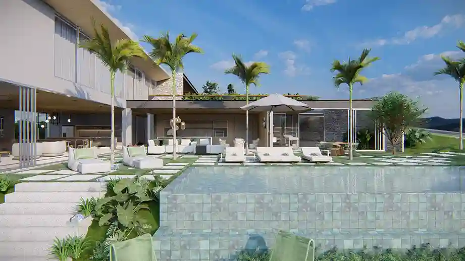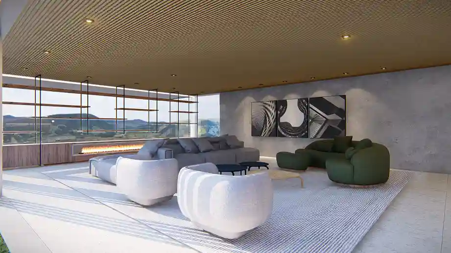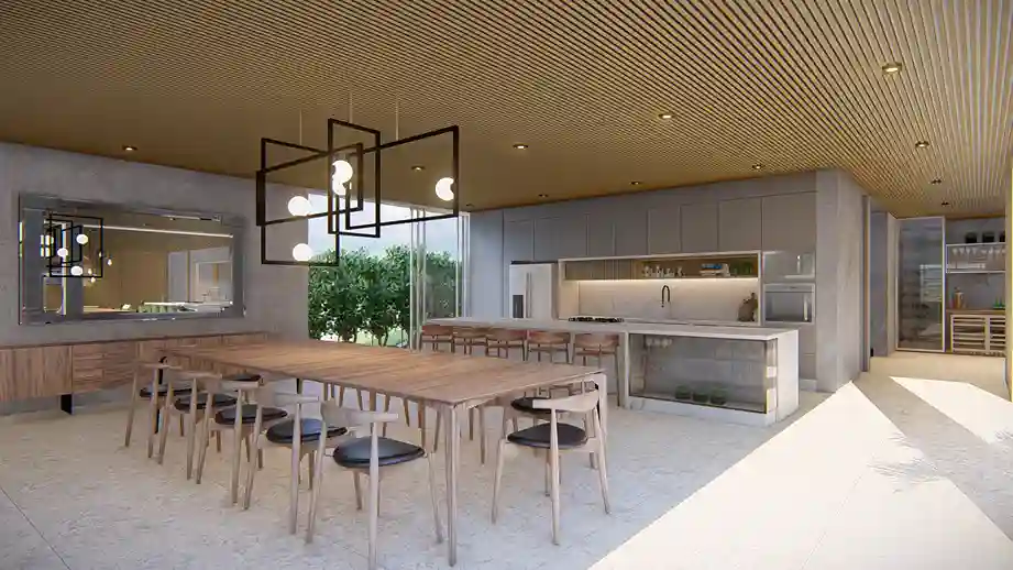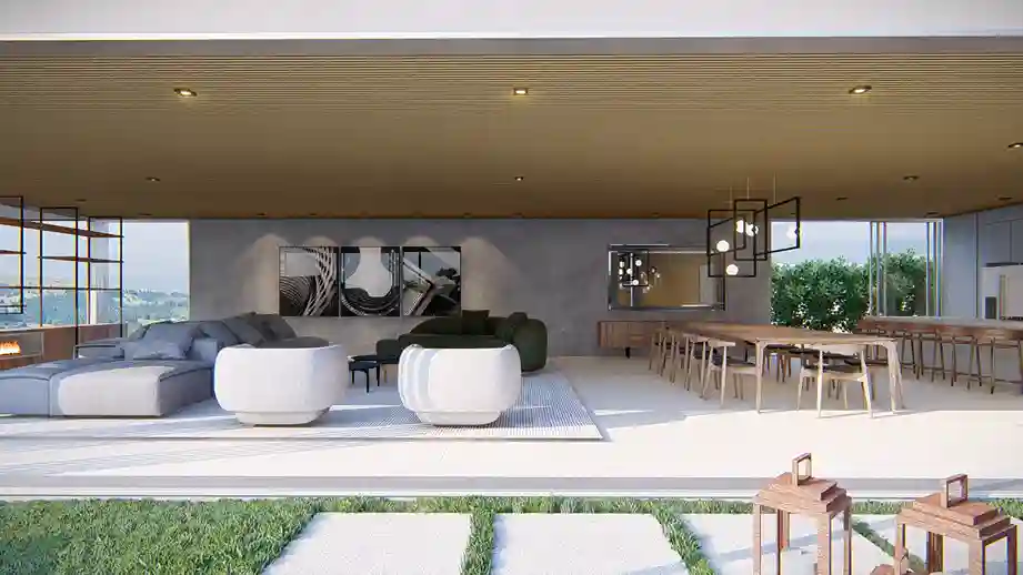 Como uma das premissas programáticas, era essencial que as salas de estar e jantar fossem amplas para a recepção dos convidados. Com isso em mente, pilares pousados sobre as extremidades oportunizam um generoso vão livre central de 19 metros de largura, onde o fechamento é realizado por folhas de vidro, sublinhando leveza ao conjunto.