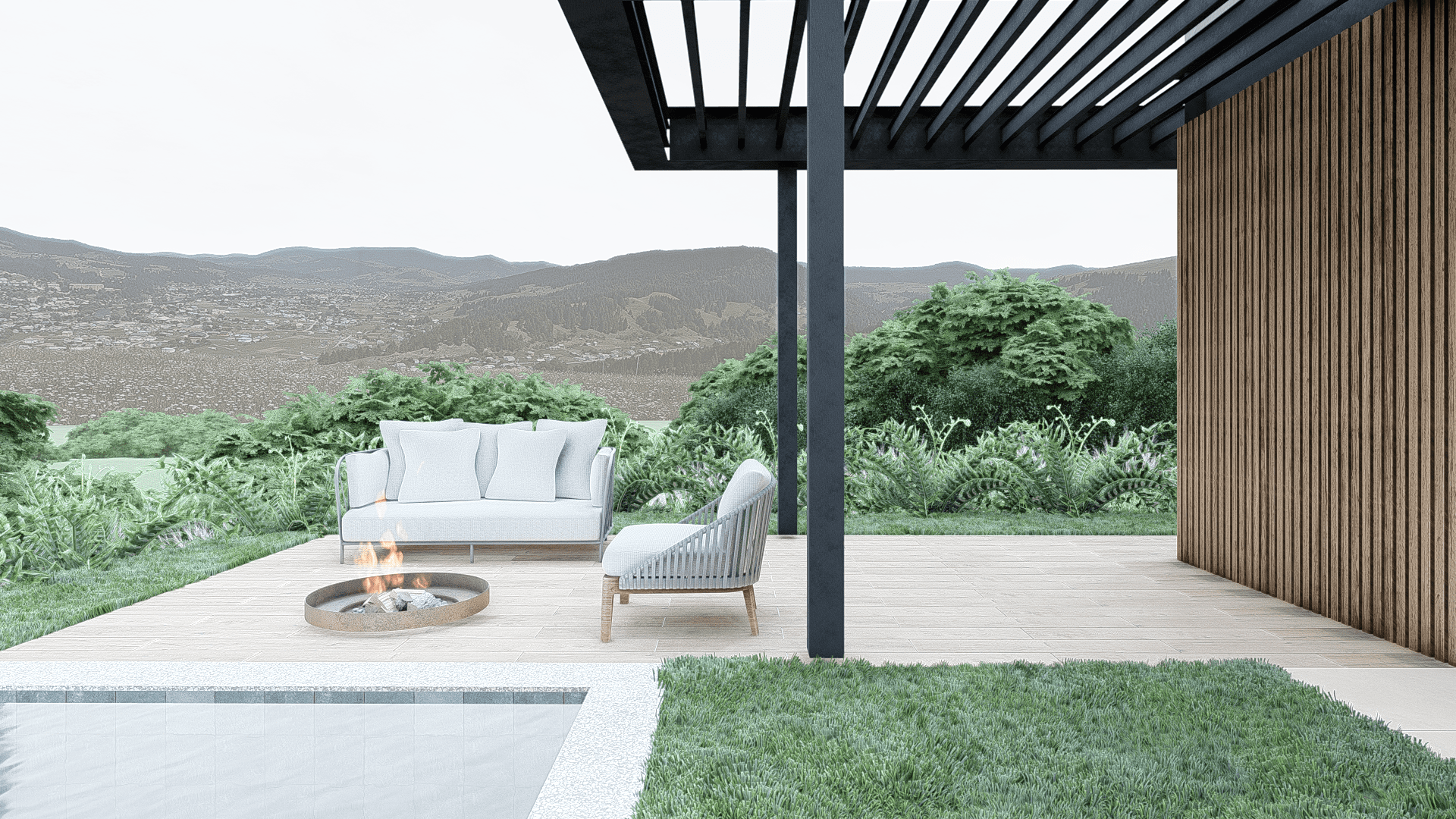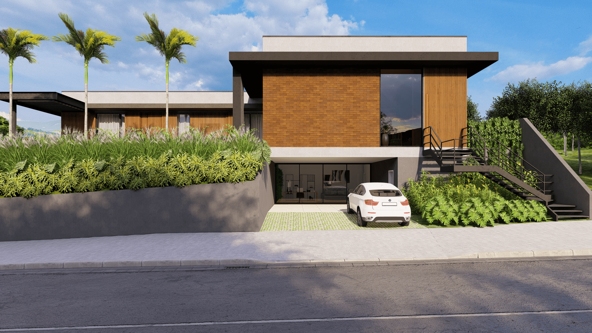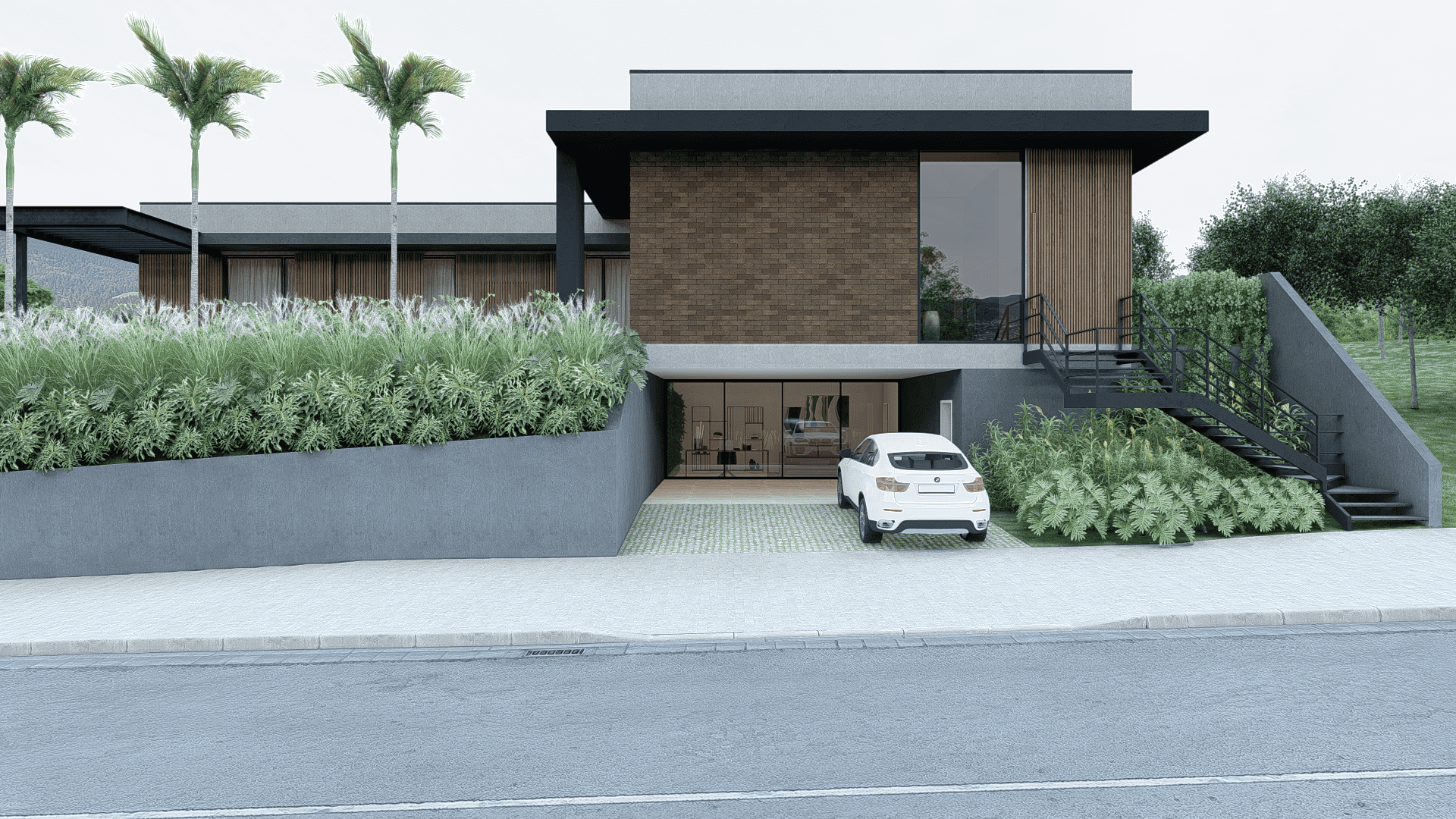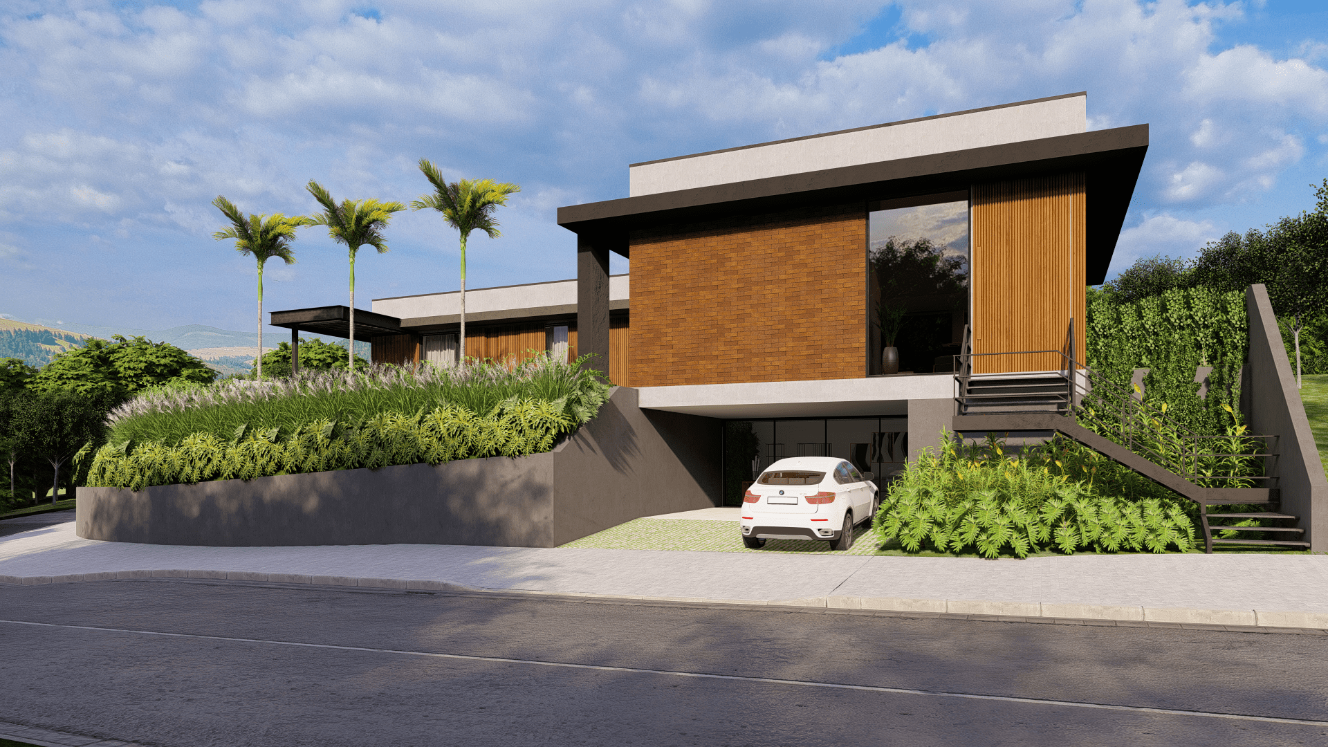 A residência MC está localizada em um terreno de esquina com desnível diagonal, por isso, foi necessário idealizar uma implantação que se adaptasse à esse desnível, a fim de minimizarmos a movimentação de terra.