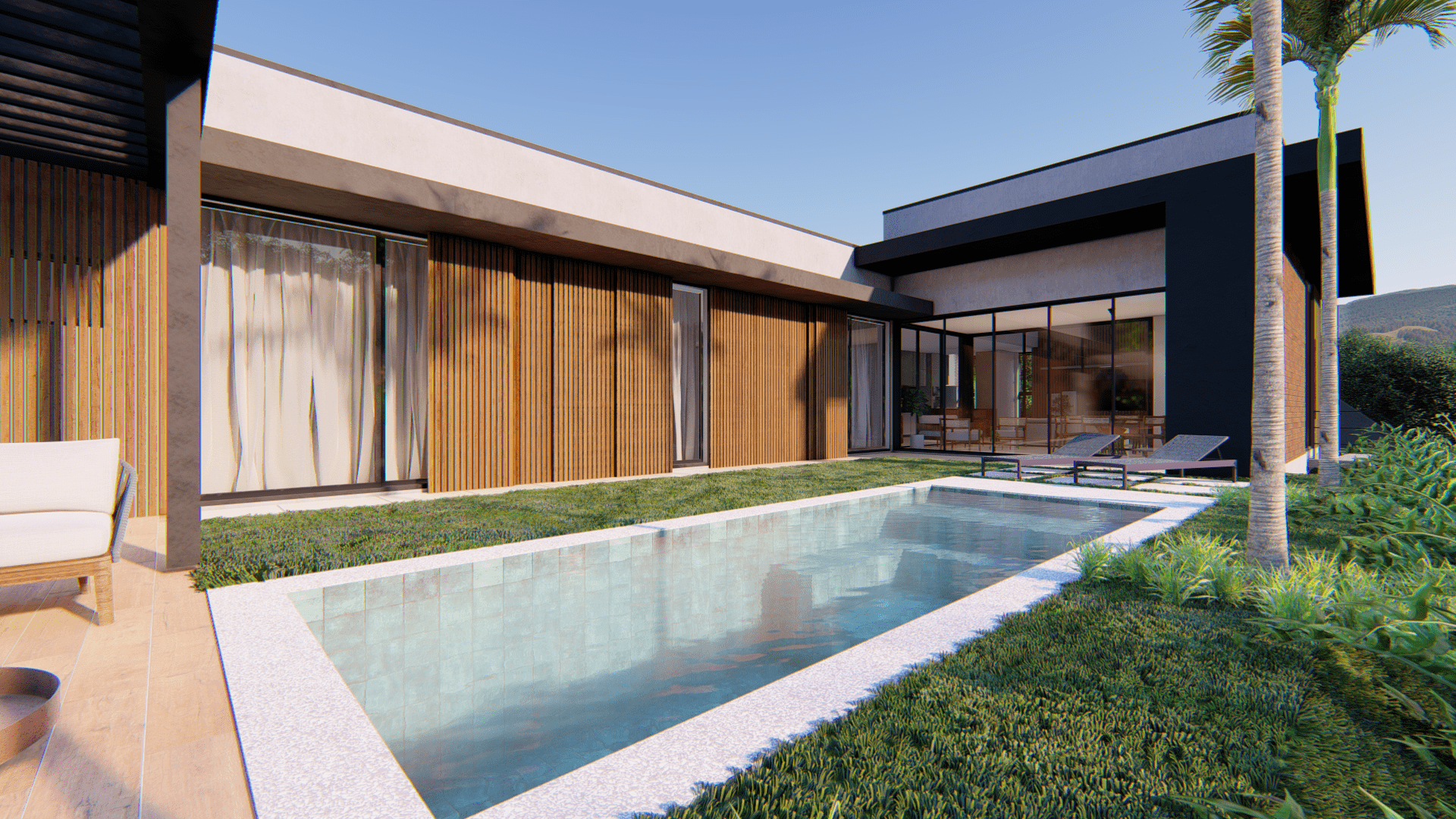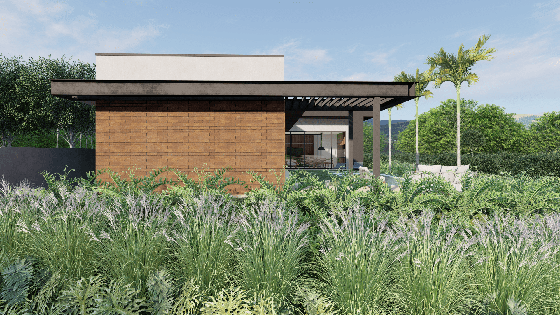 Desenvolvemos, então, uma casa térrea implantada no nível mais alto do terreno, com um acesso pela fachada da lateral, e um andar semienterrado com acesso pela fachada principal, onde foi disposta a garagem, a caixa de escada e o hall de entrada. Buscando a melhor orientação solar e conforto térmico, todas as aberturas da casa estão voltadas à orientação Norte, criando uma área de estar e social confortável e integrada à todos os ambientes, pois voltam-se à esta. Esse posicionamento busca orientar o edifício em direção aos pontos mais favoráveis da paisagem, ao mesmo tempo em que confere privacidade em relação ao vizinhos laterais. Característica do modernismo, os ambientes são integrados formando um grande ambiente social. Os destaques ficam para o uso dos materiais: metálica, tijolinho, ripado de madeira e tons de cinza.
