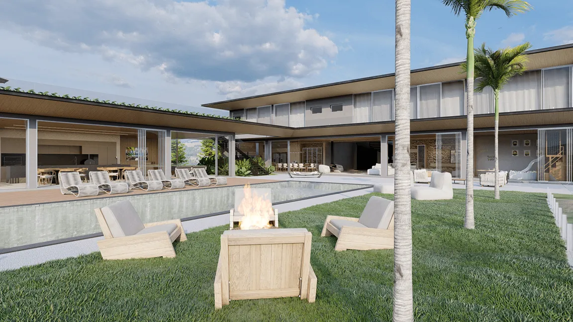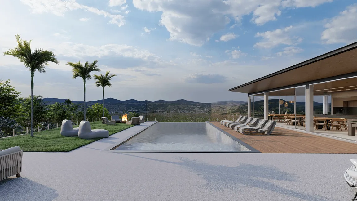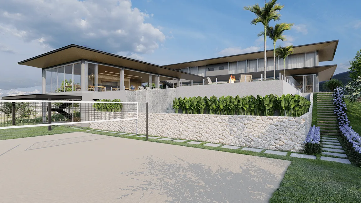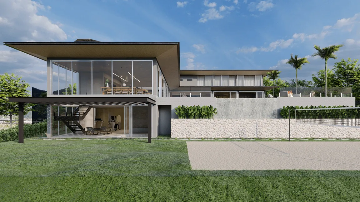 O pavimento de acesso abriga, além da cozinha, as salas de jantar, estar e lareira que tem suas fronteiras dissolvidas para o espaço externo quando as portas de correr se abrem para o jardim e piscina, revelando, então, uma grande área integrada com a vista para o mar. Ainda dispõe de brinquedoteca e sala de cinema.