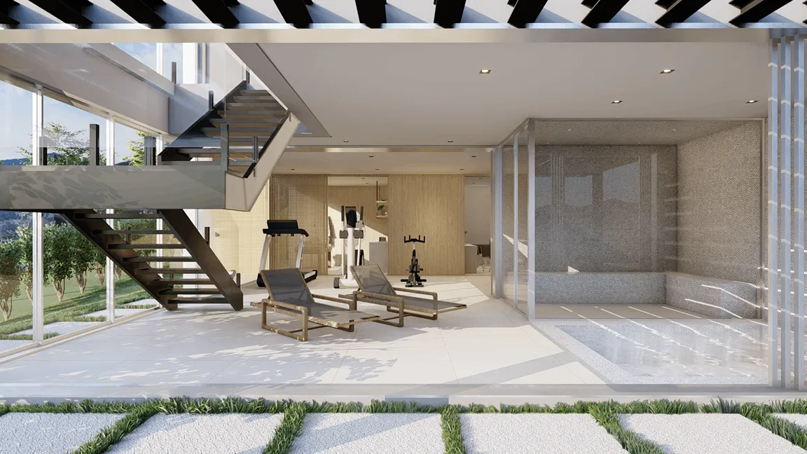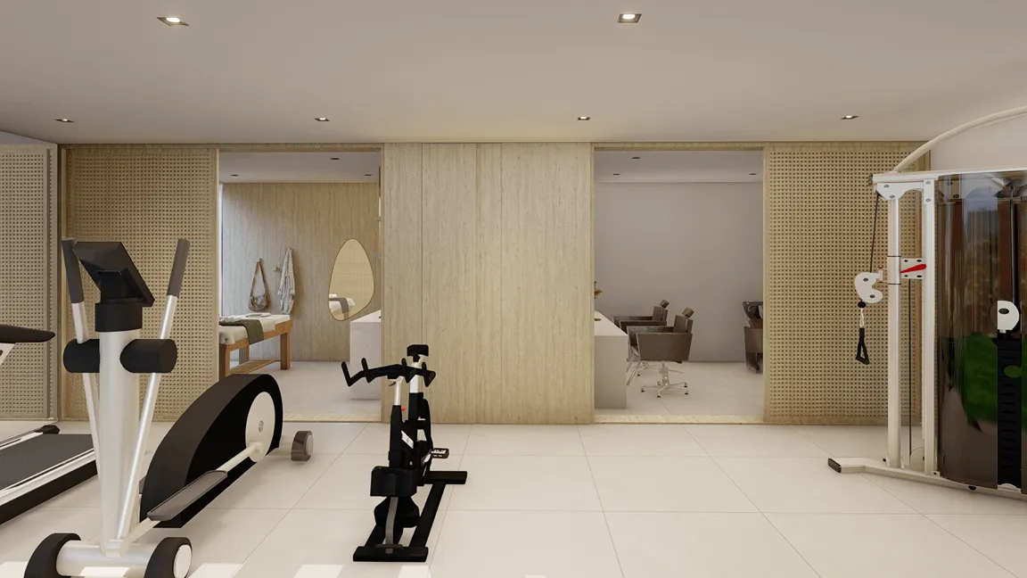 O piso inferior é protegido e reservado e abriga sauna, spa, academia, sala de massagem e salão de beleza. Este possui acesso externo, bem como interno pelo gourmet.