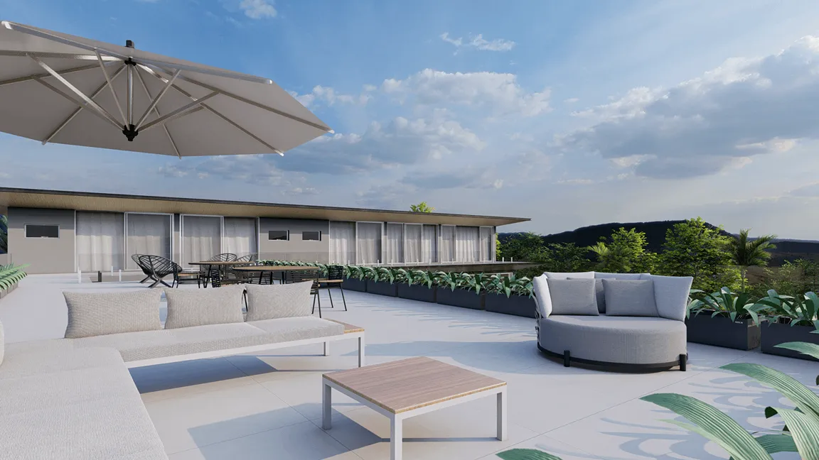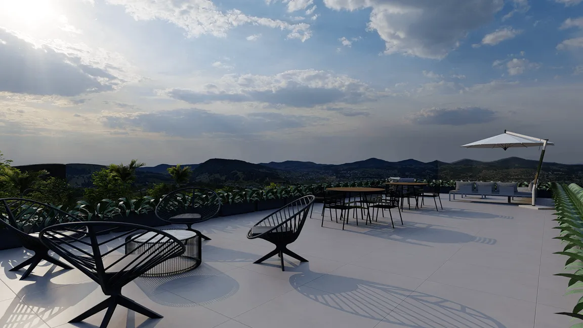 A cereja do bolo deste projeto é o rooftop projetado acima do espaço gourmet, com seu acesso entre beirais, através de uma escada metálica disposta em meio ao jardim.