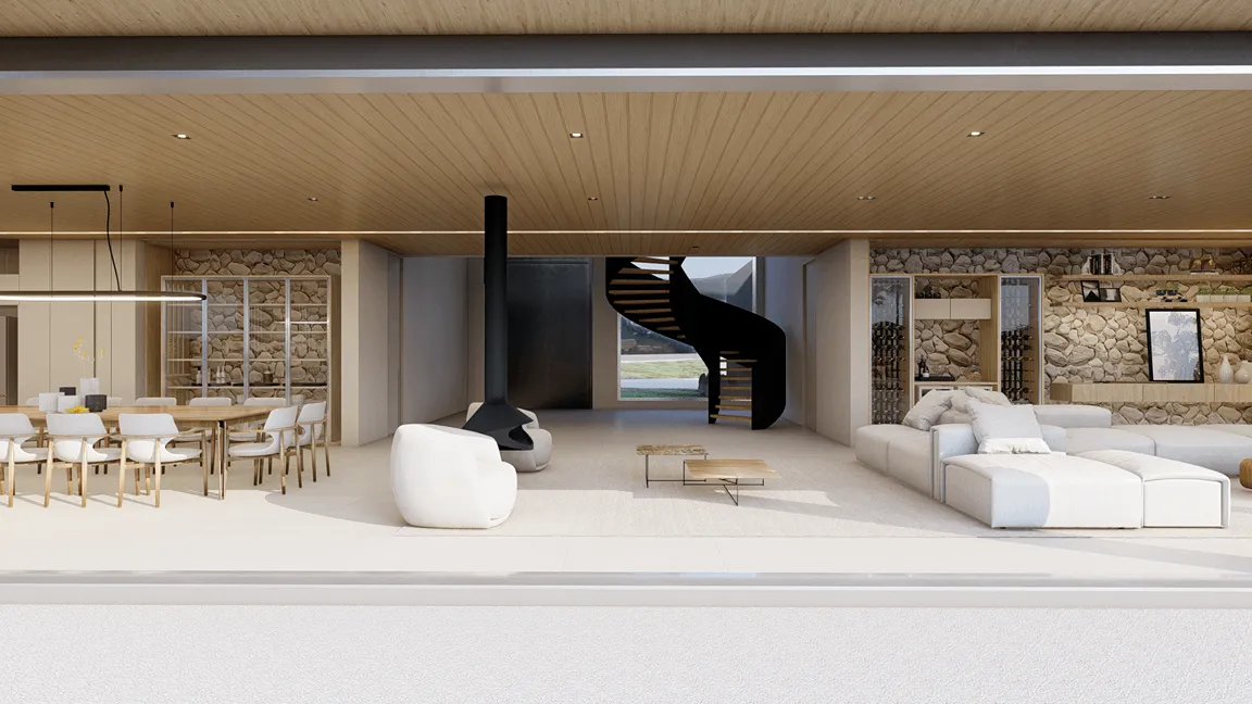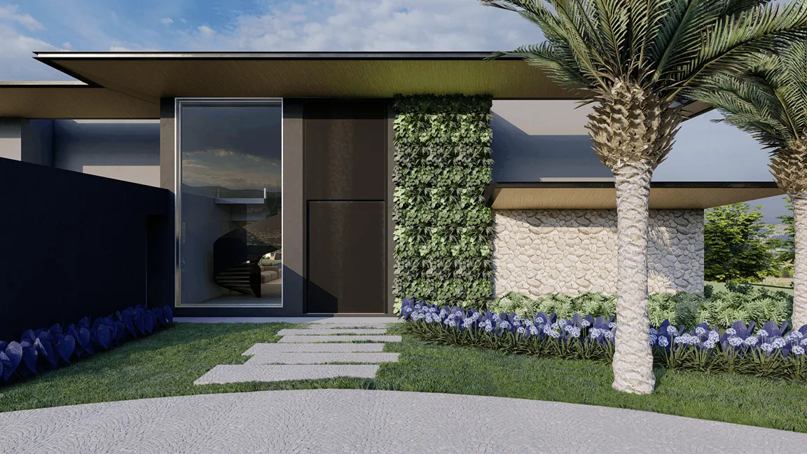 No perímetro de toda a residência, extensores metálicos formam grandes beirais, os quais recebem forro de madeira e ‘acolhem’ toda a residência. Elementos em aço, vidro, pedras naturais e madeira caracterizam a materialidade da casa pela presença constante nos pisos, forros, esquadrias e mobiliário.