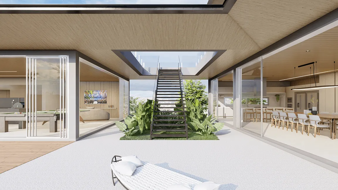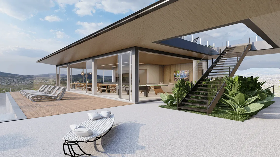 Ao centro do hall, a escada metálica conecta o térreo à área privada dos dormitórios, onde as esquadrias de correr de piso a teto podem ser completamente abertas, que junto ao guarda-corpo de vidro incolor e, trazem a brisa e o azul do horizonte ao interior, envoltos por duas grandes varandas.